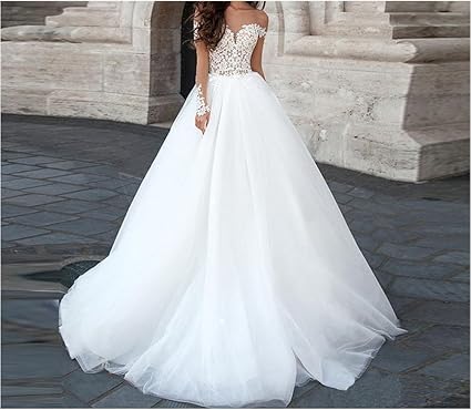 Buy A Line Round Neckline Chiffon Lace Long Open Back Sleeves Lace Sleeve Wedding Dress Open Back