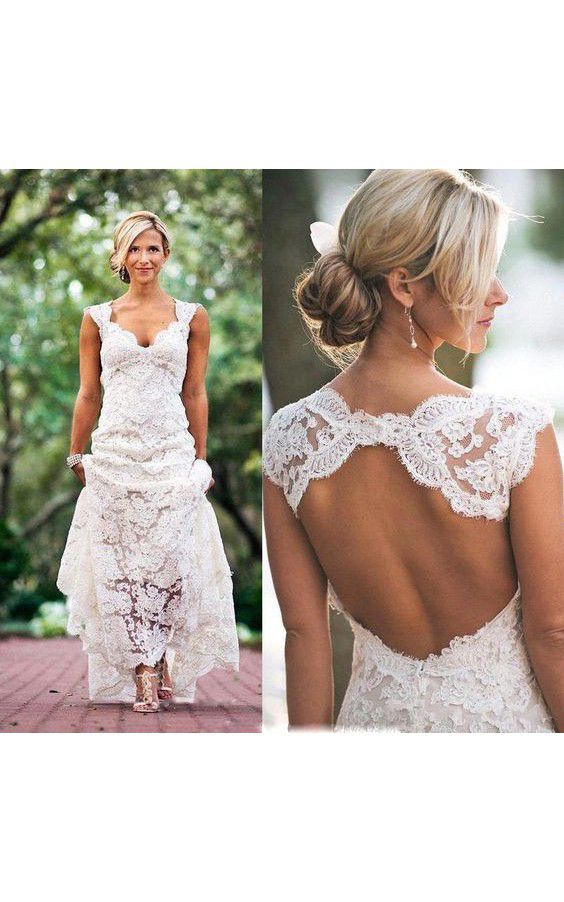 Slim A Line Lace Dress With Keyhole Back Cap Sleeved V Neck Plus Lace Slim A Line Wedding Dress