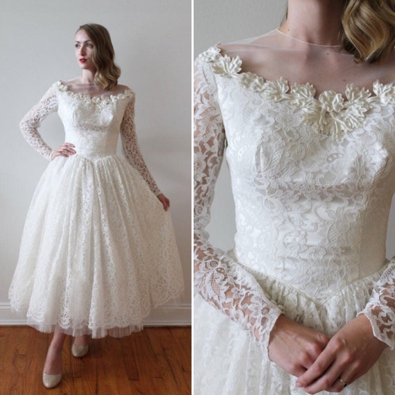 Vintage 1950s Lace Tea Length Wedding Gown With Illusion Etsy Lace Tea Length Wedding Dresses