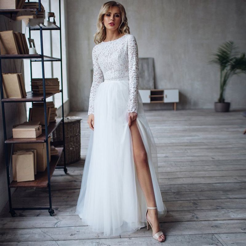 Discount Wedding Dress Lace Top Long Sleeve High Slit Tulle Skirt Lace Top Tulle Skirt Wedding Dress