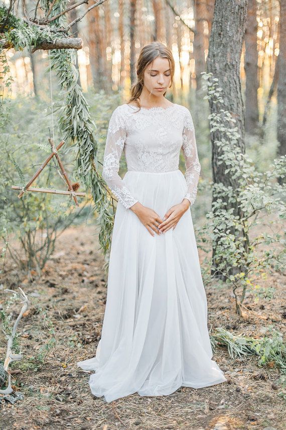 Discount A Line Bohemian Wedding Dresses Long Sleeves Lace Top Lace Top Wedding Dress With Tulle Skirt