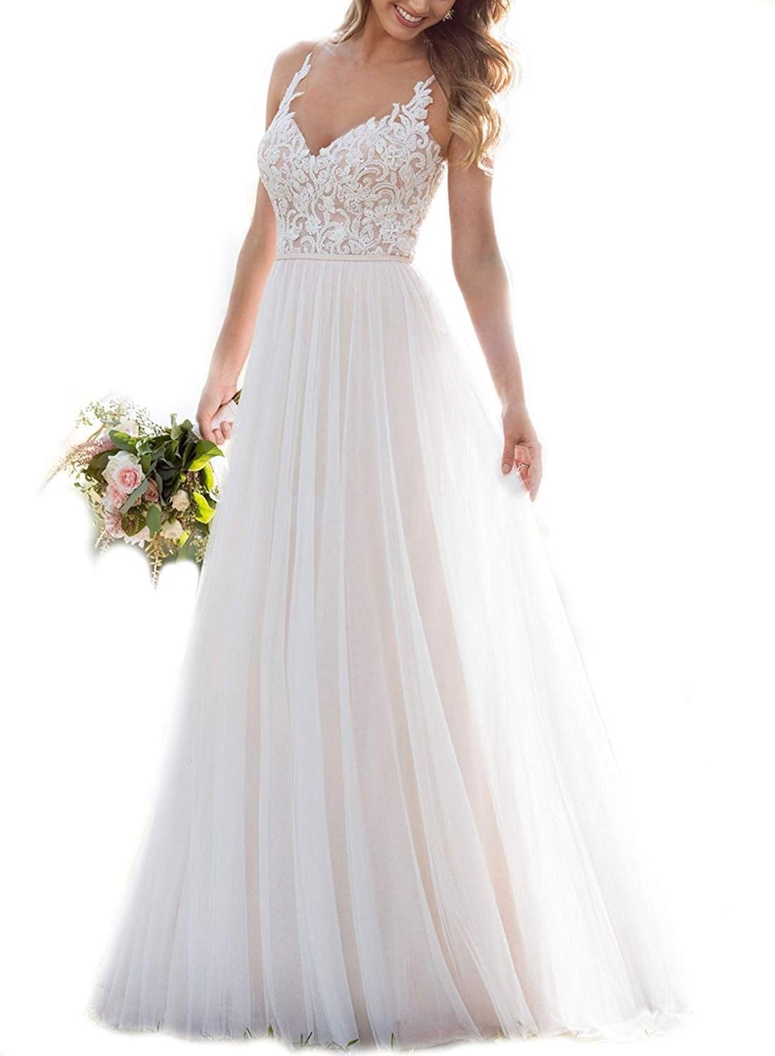 V Neck Sleeveless Lace Wedding Dresses A Line Chiffon Bridal Lace V Neck A Line Wedding Dress