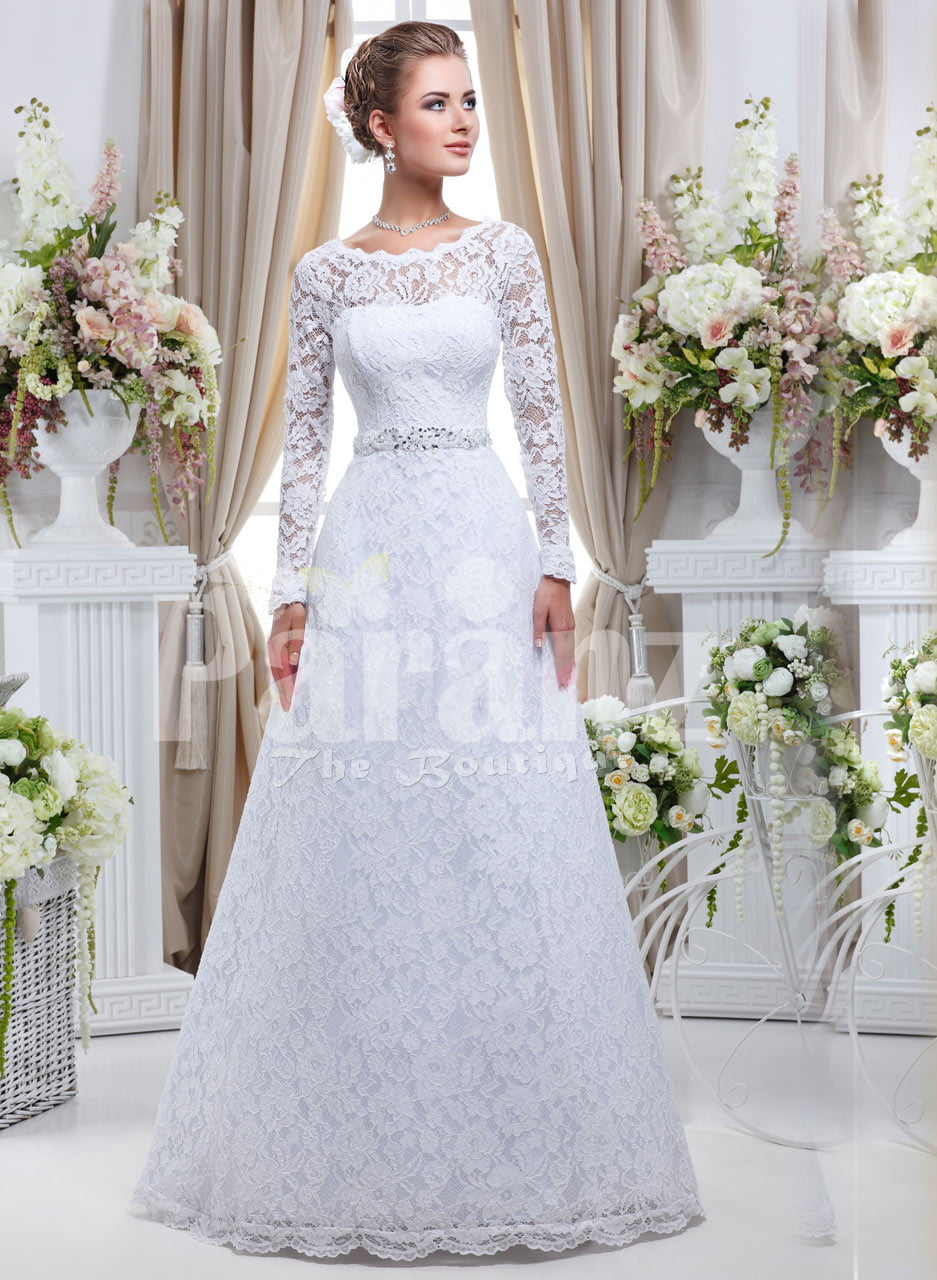 Picture Of Stunning Illusion Lace Neckline Takes Center Stage In Lace Wedding Dress With Tulle Skirt