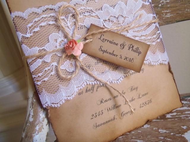Coral Rustic Lace Kraft Vintage Woodland Kraft Wedding Lace Wrapped Wedding Invitations