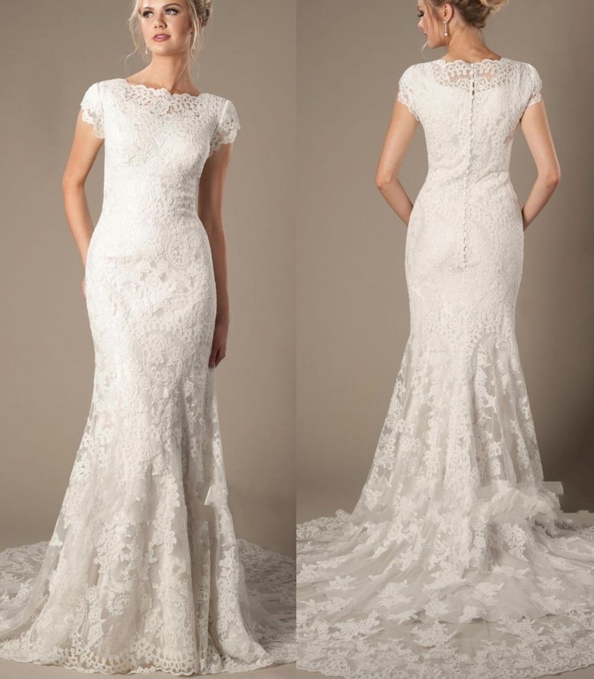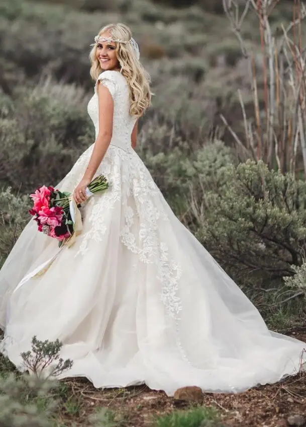 Discount 2019 Modest Wedding Dresses Lace Appliqued A Line Cap Sleeves Jewel Bohemian Wedding Dress Vestidos De Novia Plus Size Country Bridal Gowns Backless Wedding Lds Wedding Dresses Lace