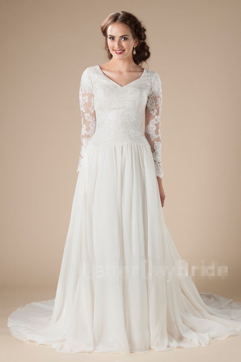 Discount A Line Boho Long Modest Wedding Dresses With Long Sleeves Buttons Back Country Western Lds Bridal Gowns Lace Top Chiffon Skirt Wedding Vintage Dresses A Line Lds Wedding Dresses Lace