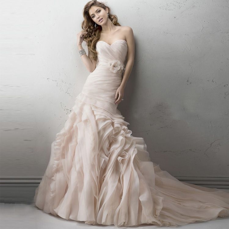 Light Pink Tiered Mermaid Wedding Dresses Chiffon Strapless Ruffles Bridal Gowns Court Train Big Hem Wedding Dress Light Pink Strapless Wedding Dresses