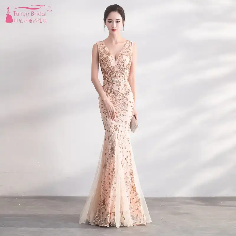 Mermaid Champagne Bridesmaid Dresses Long V Neck Floor Length Long Elegant Dresses For Wedding Guests