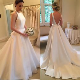 A Line High Neck Collar Low Back Satin Wedding Dress With Bow Sash Low Back Bow Wedding Dress