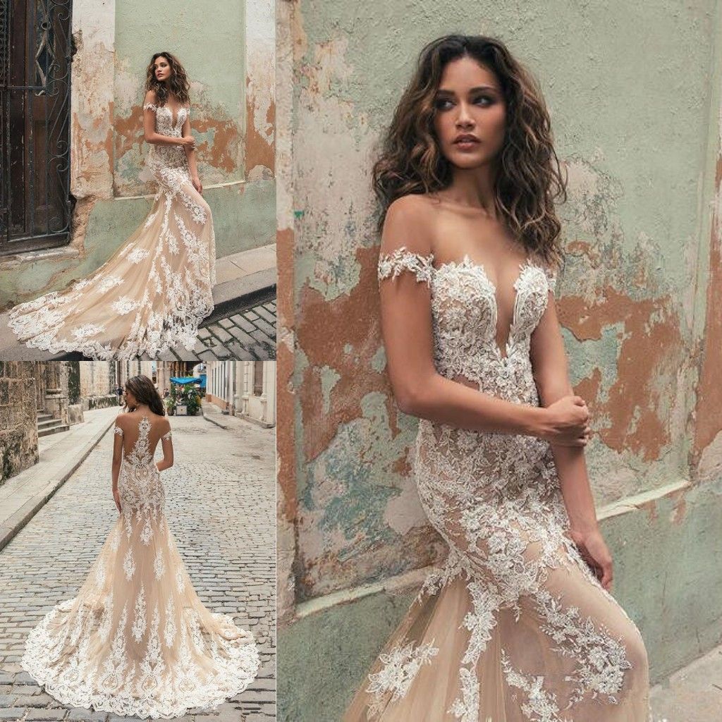 China 2019 Lace Bridal Gowns V Neck Champagne Tulle Ivory Lace Mermaid Lace Champagne Wedding Dress