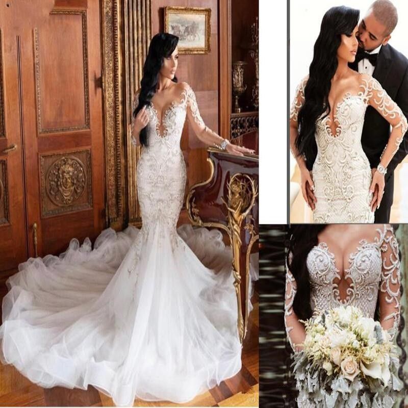 2020 African Dubai Mermaid Wedding Dresses Lace Illusion Long Mermaid Lace Illusion Wedding Dresses