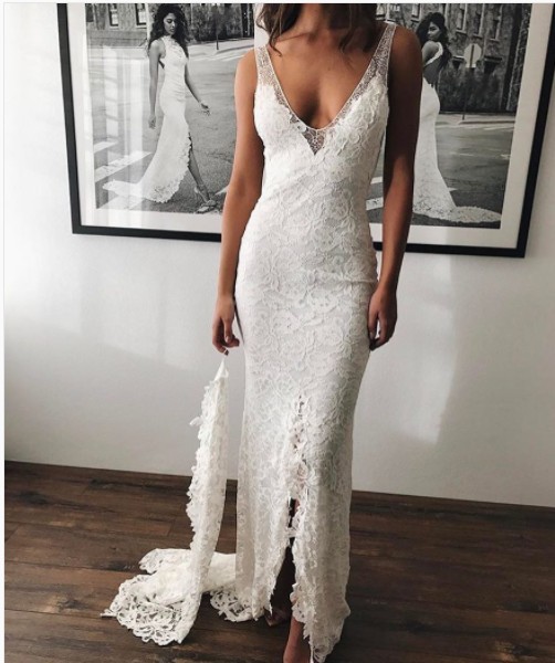 V Neck Sleeveless Mermaid Wedding Dress With Lace Bodice Mermaid Lace V Neck Wedding Dress