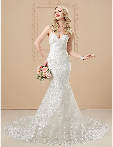 Lace Appliques V Neck White Spaghetti Straps Mermaid Wedding Dress Mermaid Sweetheart Spaghetti Strap Sweetheart Neckline Wedding Dresses