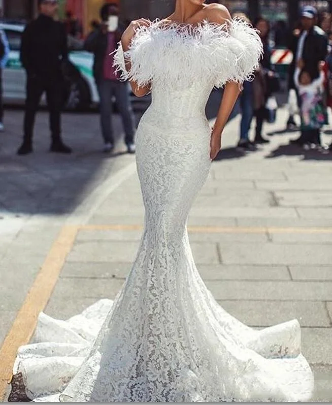 2019 Charming Off Shoulder Feather Lace Wedding Dress Fitted Slim Mermaid Wedding Dress With Feathers