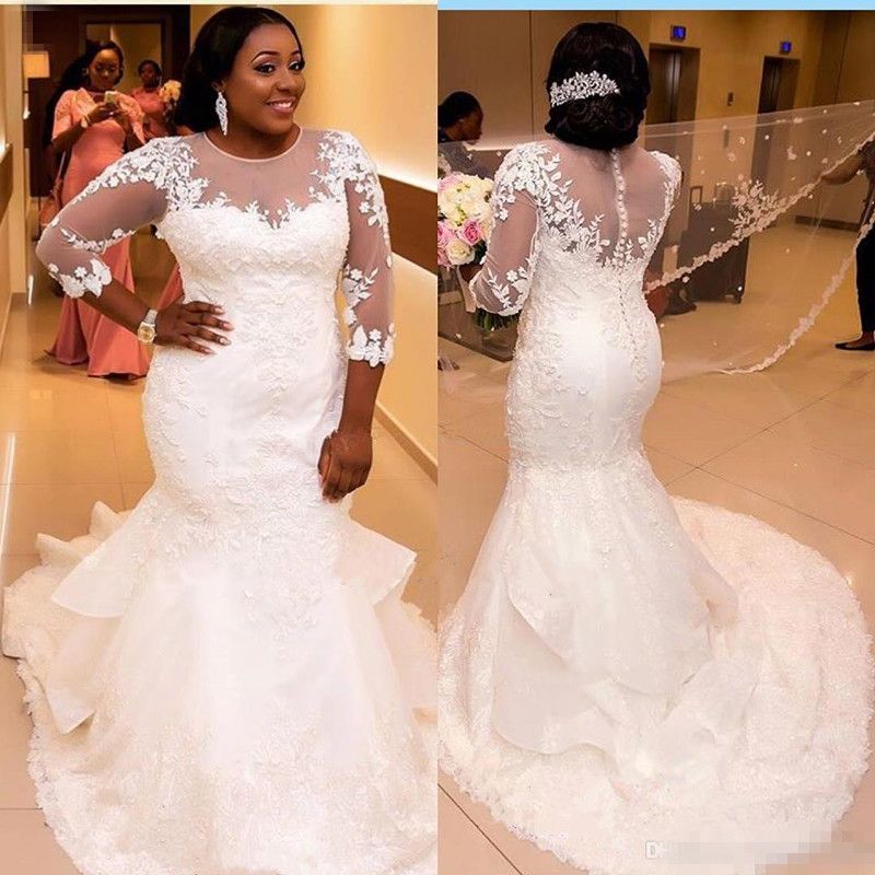 Plus Size Wedding Gowns Mermaid With Sleeves Appliques Lace Sheer Mermaid Wedding Dresses For Big Girls