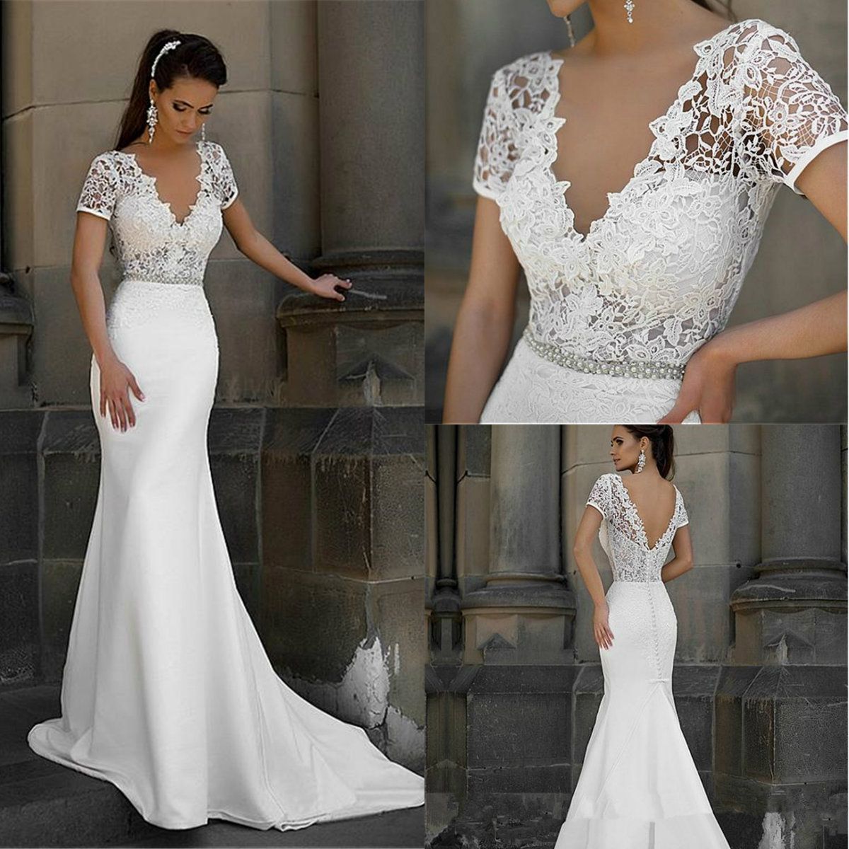 Luxury Short Sleeves Backless V Neck Mermaid Wedding Dress Sweep Mermaid Wedding Dresses With Short Sleeves