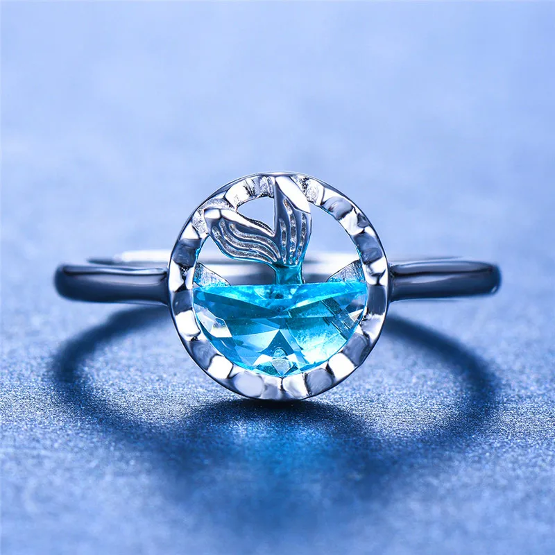 Cute Female Blue Topaz Mermaid Ring Real 925 Sterling Silver Open Mermaid Wedding Ring