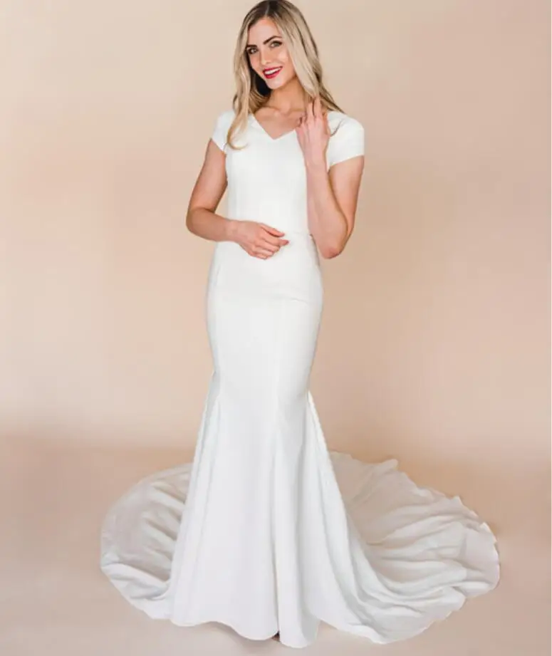 Simple Stretch Crepe Mermaid Modest Wedding Dress With Cap Sleeves V Neck Corset Back Simple Modest Wedding Gowns With Sleeves Wedding Dresses Aliexpress Modest Simple Wedding Dresses