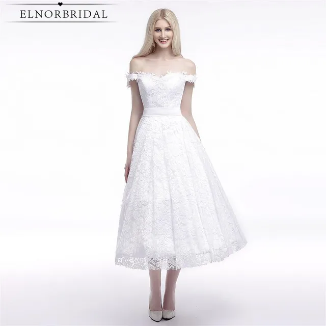Discount 2019 Bohemian Tea Length Wedding Dresses Beads Sheer Modest Tea Length Wedding Dresses