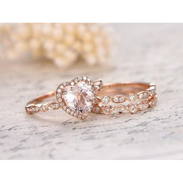 Jeenmata 2 Carat Heart Shape Morganite And Diamond Halo Trio Wedding Ring Set With Engagement Ring And Art Deco Morganite Wedding Ring Sets
