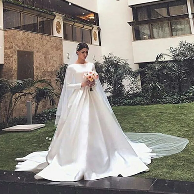 Jieruize White Satin Simple Wedding Dresses Long Sleeves Muslim Wedding Gowns Bride Dresses Robe De Mariee July 2020 Muslim Wedding Dress For Bride