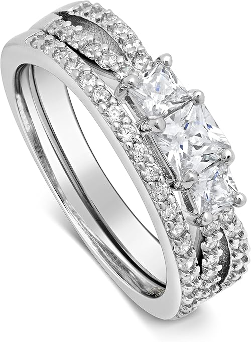 Amazon Com Dtla Sterling Silver Past Present Future Princess Cut Past Present Future Ring With Wedding Band