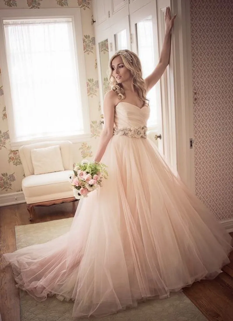 Is057 Uniqe Peach Color Soft Tulle Ball Gown Wedding Dress Online Peach Colored Wedding Dress