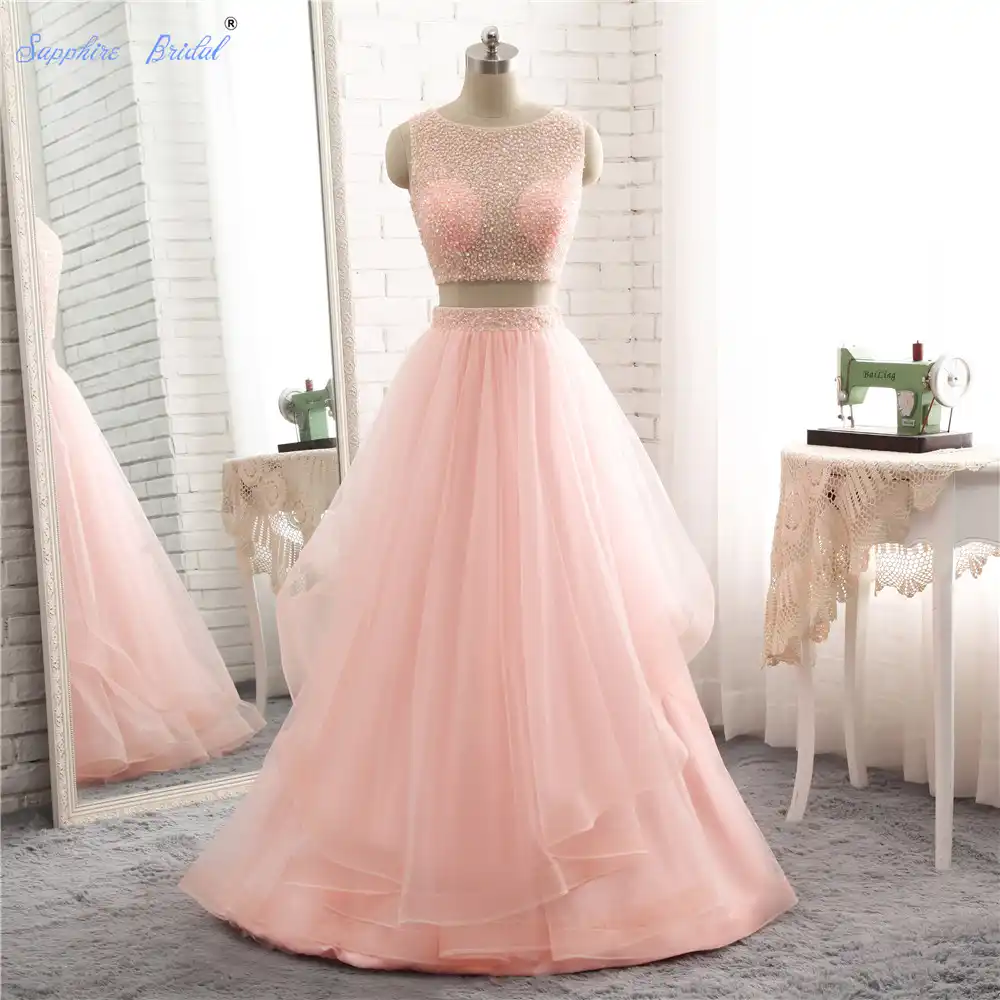 Blush Pink Long Bridesmaid Dress With Pearls Beaded Lace Appliques Pink Beaded Wedding Dress