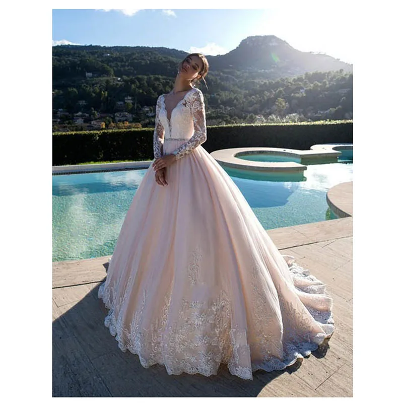 Wedding Dresses 2019 Long Sleeves Lace Appliques Sweep Train Plus Pink Plus Size Long Sleeve Wedding Dress