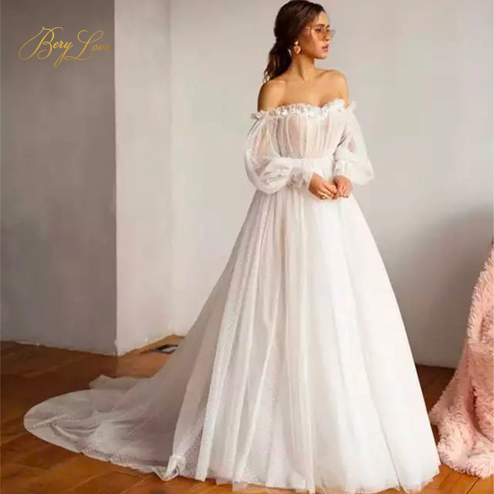 Plain Ivory Dot Tulle Wedding Dresses Off The Shoulder Long Plain Ivory Wedding Dress