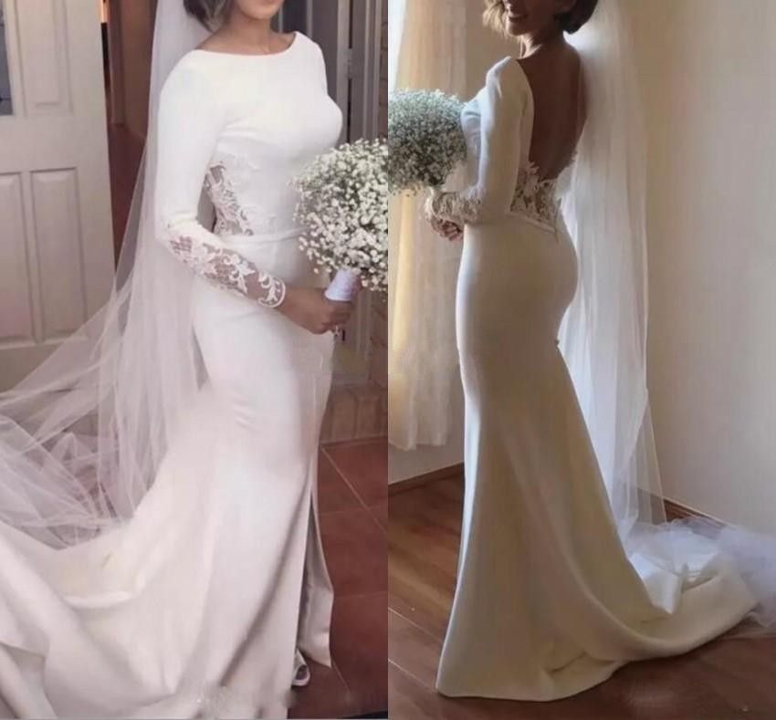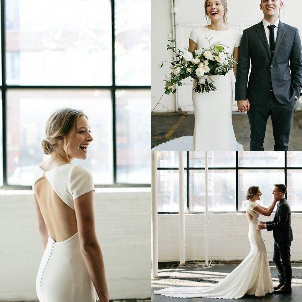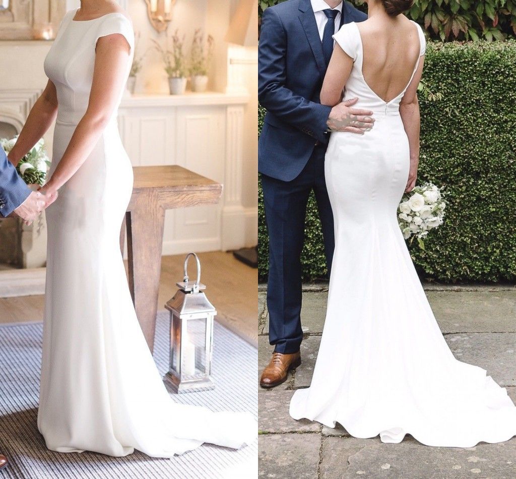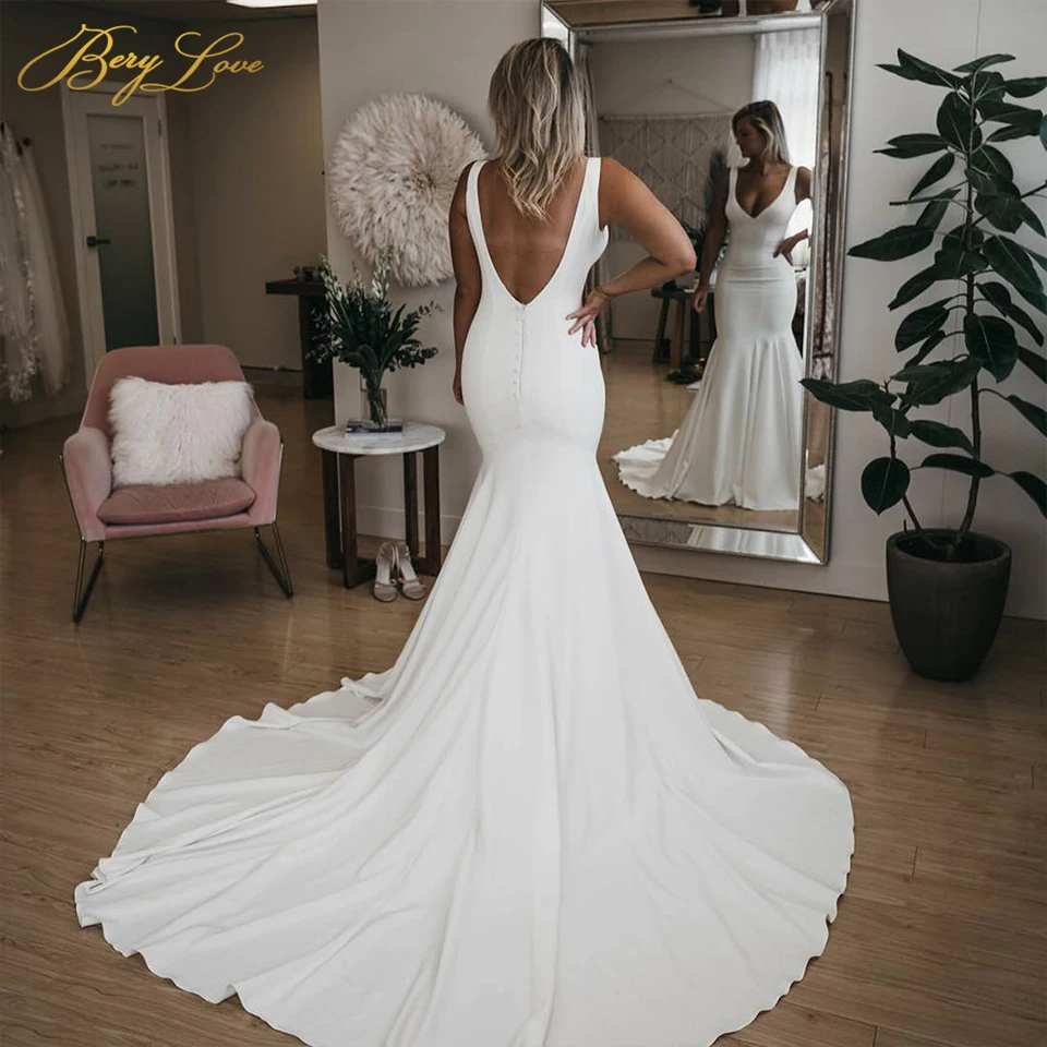 Plain Ivory Mermaid Wedding Dress 2020 Crepe Sexy V Neck Chapel Plain Mermaid Wedding Dress