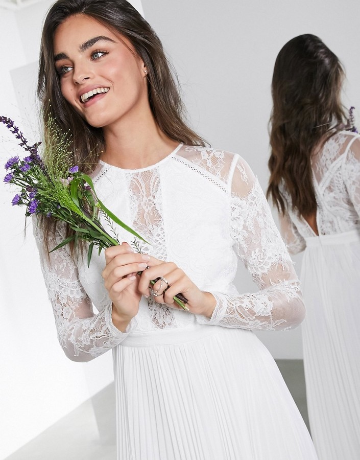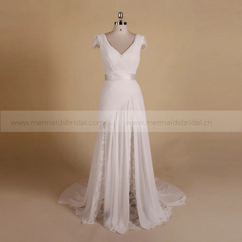Engaging Boho Sheath Cap Sleeve Lace Chiffon Pleated Wedding Dress Pleated Wedding Dresses