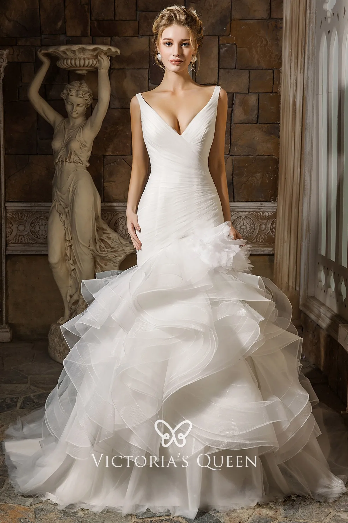 New Arrival A Line V Neck Tulle Sweep Train Pleats Backless Pleated Wedding Dresses