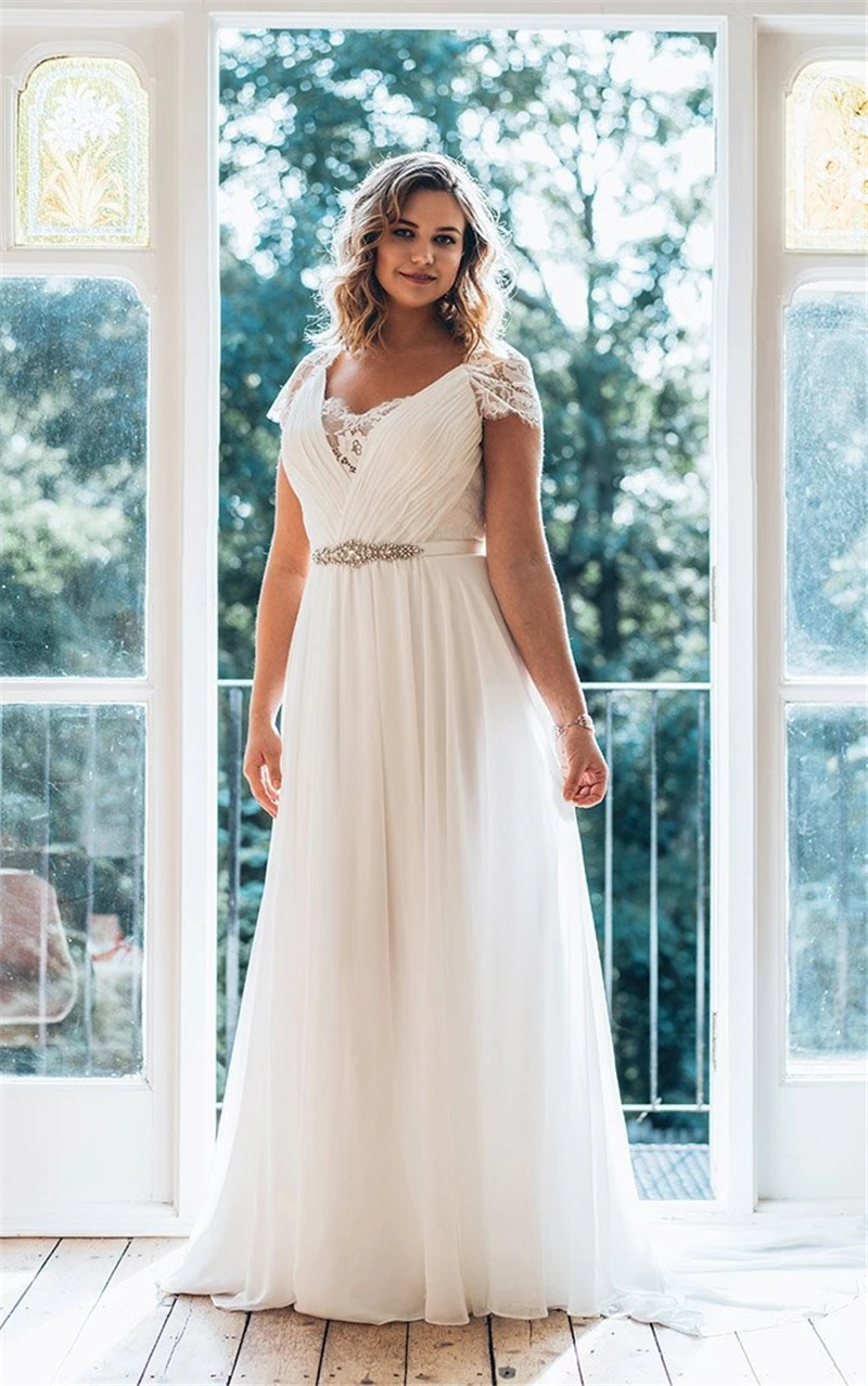 Elegant V Neck Cap Sleeves Plus Size Wedding Dress Beaded Empire Plus Size Chiffon Wedding Dresses With Sleeves