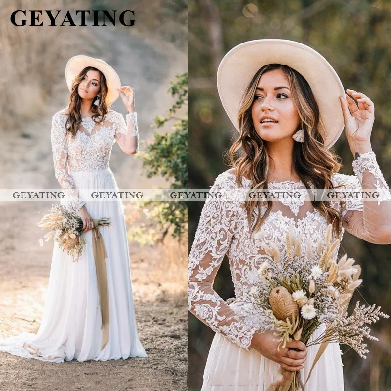 Plus Size Boho Wedding Dress Long Sleeves Lace Applique Sweep Plus Size Country Style Wedding Dresses