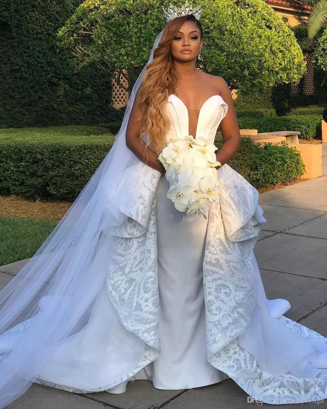 Stylish Mermaid Lace Wedding Dresses With Detachable Skirt Beaded Plus Size Detachable Skirt Wedding Dress