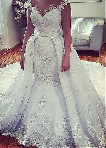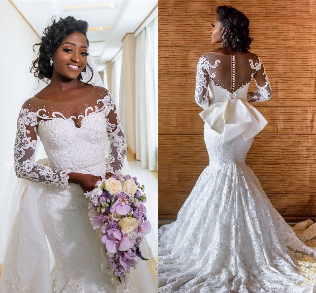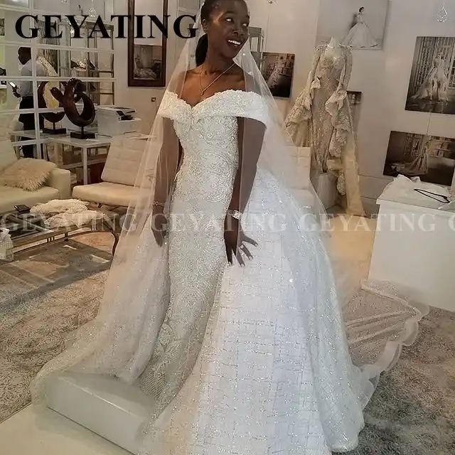 2020 Luxury Off Shoulder Lace Mermaid African Wedding Dress With Plus Size Detachable Train Wedding Dress