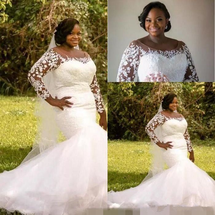 Plus Size White Long Sleeve Lace Mermaid Wedding Dress 2019 Illusion Beaded Lace Appliques Fit And Flare Bridal Gowns Corset Lace Up Back Mermaid Cut Wedding Dress Mermaid Tail Wedding Dress From Plus Size Fit And Flare Wedding Dresses With Sleeves
