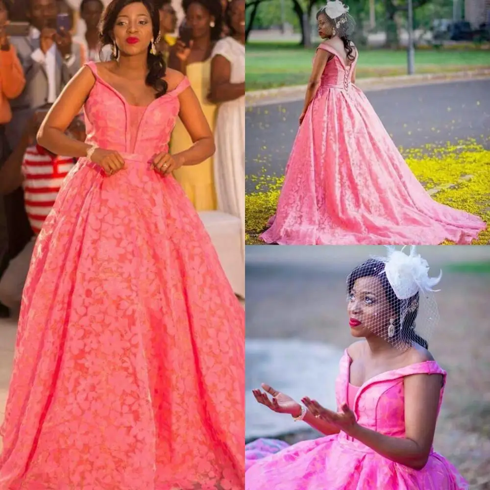 Saudi Arabic Hot Pink Lace Wedding Dresses Off Shoulder African Plus Size Hot Pink Wedding Dress