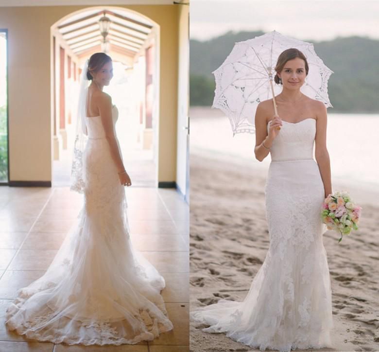 Hot 2018 Lace Beach Wedding Dresses Mermaid Strapless Sweep Train Plus Size Lace Beach Wedding Dress