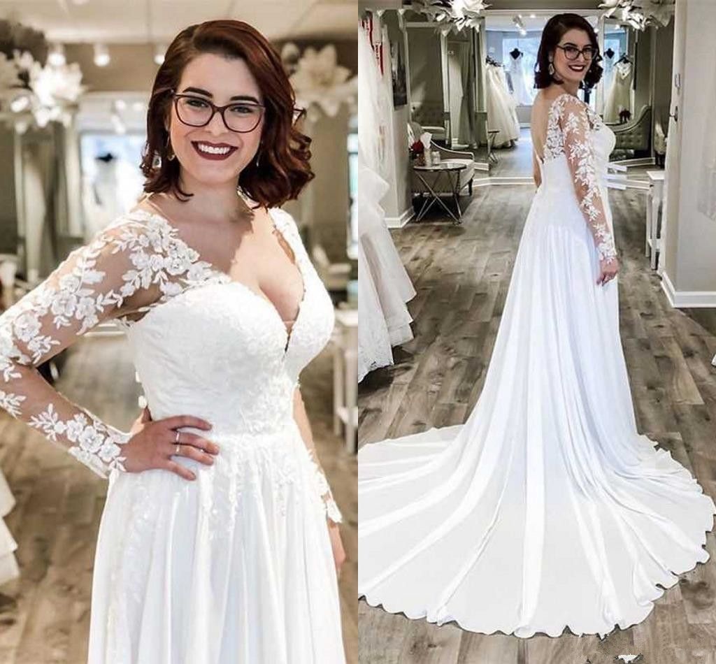 Discount Lace Chiffon Long Sleeve Wedding Dresses 2020 Simple Plus Size Lace Sleeve Wedding Dress