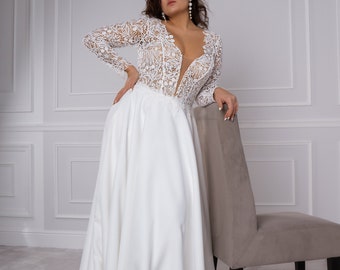 Plus Size High Neck Illusion Back Long Sleeve Muslim Wedding Dress Plus Size Long Sleeve High Neck Wedding Dresses