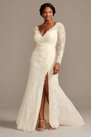 Illusion Sleeve Faux Wrap Plus Size Wedding Dress David S Bridal Plus Size Long Sleeve Wedding Dresses