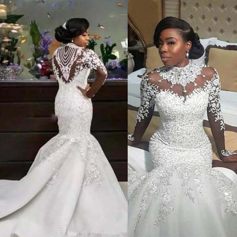 2020 African Plus Size Mermaid Wedding Dress Lace Appliques Long Plus Size Mermaid Wedding Dress With Lace Sleeves