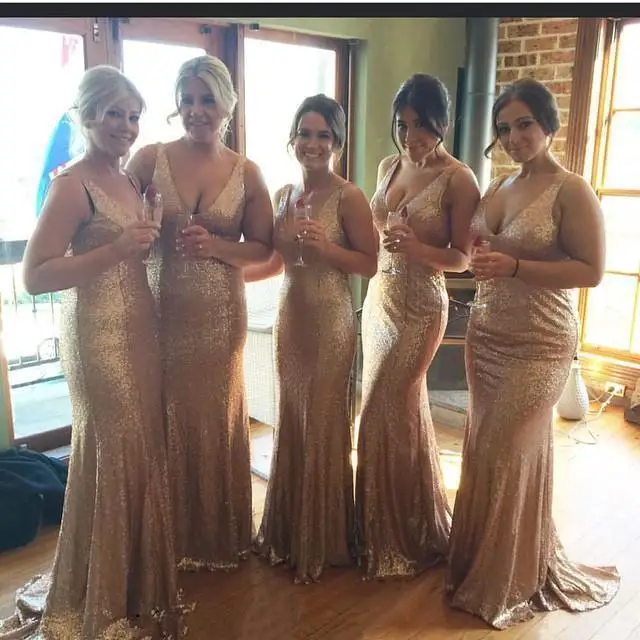 Misshow Women S V Neck Ruched Ruffle Long Sequins Bridesmaid Dress Plus Size Rose Gold Dress For Wedding Guest