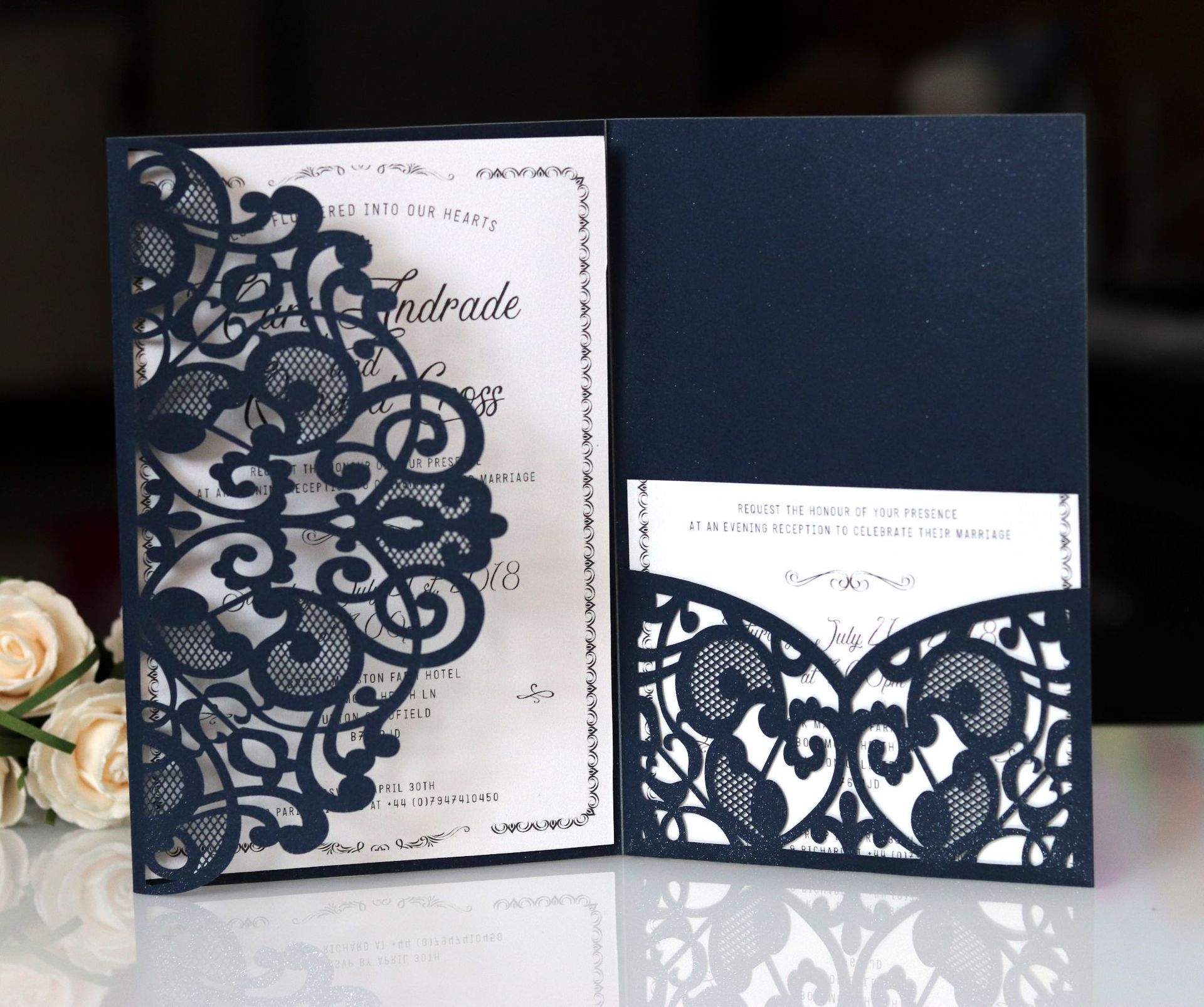 Romantic Dark Navy Spring Flower Glittery Laser Cut Pocket Wedding Invitation Kits Customizable Invites Canada 2019 From Shirley S Cad 67 87 Dhgate Canada Pocket Wedding Invitation Kits