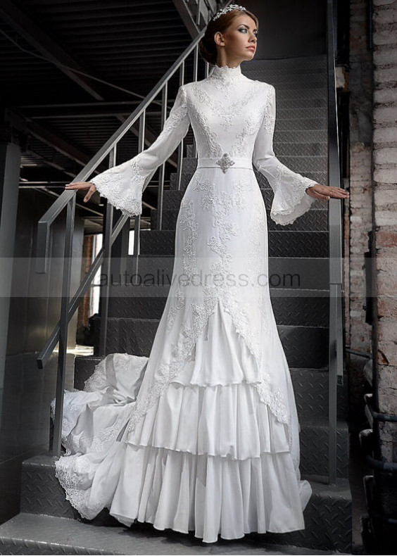 Sheath High Neck Sweep Train Long Poet Sleeves Ivory Lace Chiffon Drss Poet Sleeve Wedding Dress