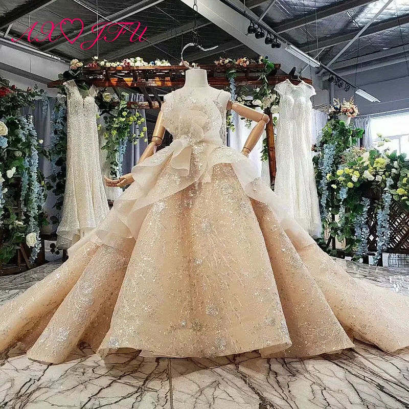 Axjfu Luxury Princess Golden Lace Ruffles Spaghetti Strap Beading Princess Golden Wedding Dresses
