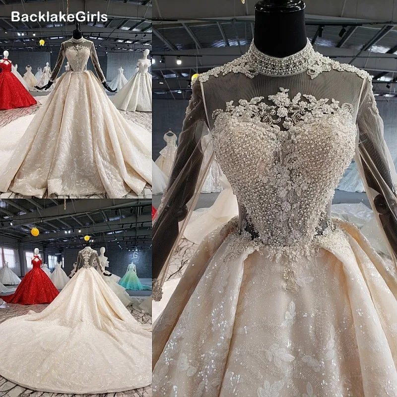 Peacock Princess Long Sleeves High Neck Ball Gown Lace Wedding Princess High Neck Ball Gown Wedding Dress