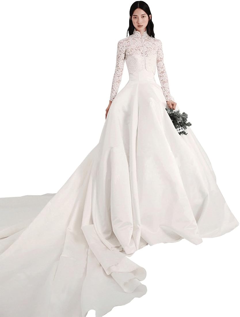 A Line Princess High Neck Full Long Sleeve Chapel Train Lace Princess High Neck Ball Gown Wedding Dress